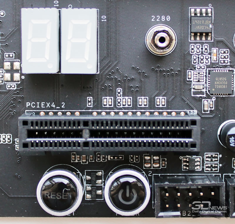Облегчить поиск ошибок при загрузке поможет индикатор POST-кодов, а под ним есть кнопки включения и перезагрузки.