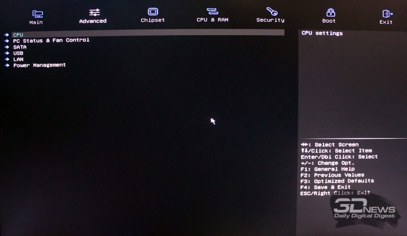 Далее идёт раздел Advanced, состоящий из шести подразделов с настройками процессора и установленных в плату компонентов.