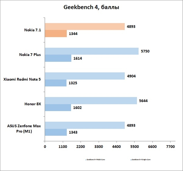 За Snapdragon 660, которая установлена в Nokia 7 Plus или, например, в дорогущий Samsung Galaxy A9 (2018), она не угонится, но обеспечить нормальный пользовательский опыт владельцам Nokia 7.1 она вполне может. Базовые приложения работают очень шустро, пока позволяет оперативная память, большинство игр запустится без проблем – но рассчитывать на серьезные графические подвиги от этого смартфона не стоит.