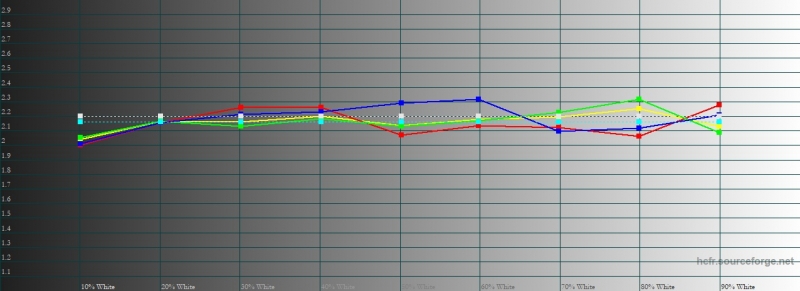 Пользовательская регулировка цветопередачи в Nokia 7.1 не предусмотрена – можно полагаться на точность заводских настроек. И если в Nokia 7 Plus с этим был порядок, то в 7.1 ситуация, увы, иная. Средняя гамма – 2,16 при довольно стабильном поведении кривых, тут все нормально. А вот цветовая температура необоснованно завышена и гуляет в промежутке от 8 500 К до 10 500 К с медианой примерно в 9 500-10 000 К. Цветовое пространство приближается к DCI-P3, как и должно быть на экране с поддержкой HDR, но о точности цветопередачи говорить не приходится: среднее отклонение DeltaE по расширенной палитре Color Checker (оттенки серого + широкий набор цветовых оттенков) составляет 6,86 при эталоне в 3. Картинка очень холодная, цвета яркие, но не слишком честные.