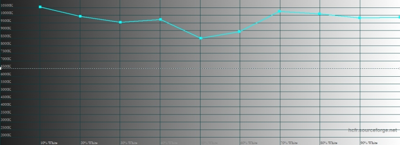 Nokia 7.1, цветовая температура. Голубая линия – показатели Nokia 7.1, пунктирная – эталонная температура