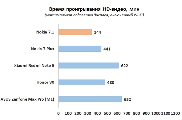 В нашем традиционном тесте с воспроизведением HD-видео на максимальной яркости при включенном беспроводном соединении с действующими обновлениями Nokia 7.1 продержался менее шести с половиной часов – результат слабый.