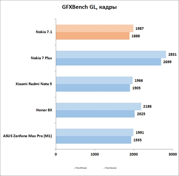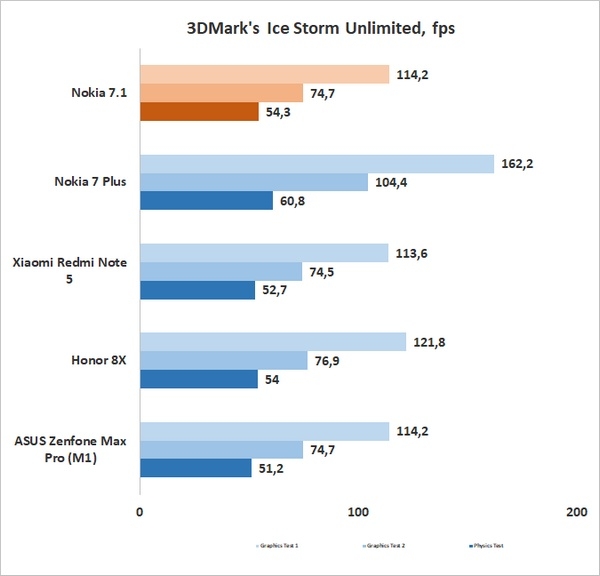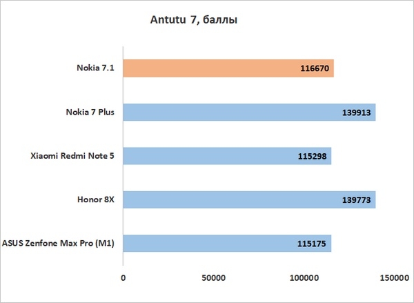 Приятно, что создатели Nokia 7.1 позаботились о нормальном охлаждении – у смартфона нет проблем с троттлингом. За время 15-минутного теста CPU Throttling Test частота понижалась лишь до 89 %, средний уровень производительности составил 116 GIPS. Где Nokia 7.1 хороша – там хороша. Для сравнения: у тоже неплохо себя проявившего в этом тесте Honor 8X произошло понижение до 81 % при средней производительности в 112 GIPS.