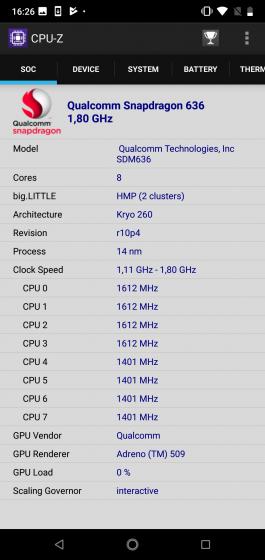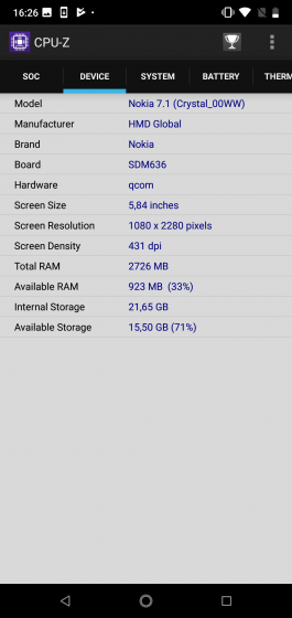 Nokia 7.1 – информация о начинке по данным приложения CPU-Z
