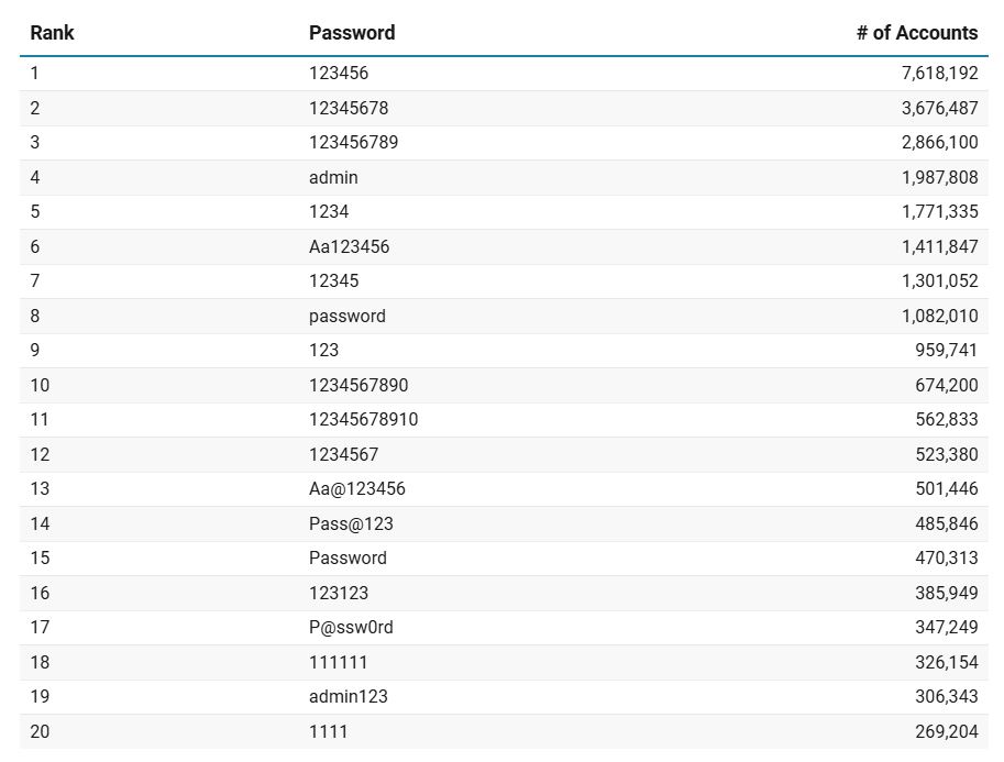 В список «лидеров» вошли не только классические «admin» и «password», но и последовательности цифр от 1 до 9. Также в топ-100 попали более новые вариации, вроде «Aa123456» на шестой позиции и «Aa@123456» — на тринадцатой.
