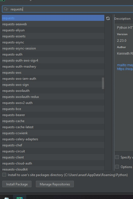 Жмем плюсик с правой стороны окна и ****аем в поиск requests, там на автомате у вас выберется нужная библиотека, жмете install package