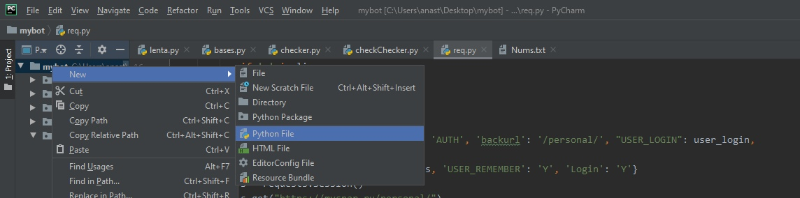 Теперь жмем на папку слева правой кнопкой мыши new -> python file -> выбираете имя вашего файла и создаете его