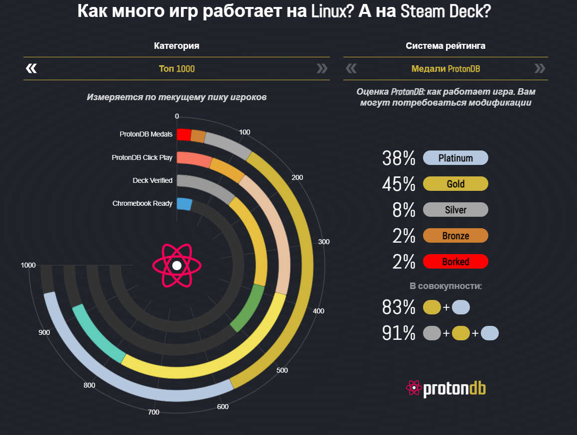 Но такие цифры требуют корректировки, т.к. статистика ProtonDB собирается добровольно. Игроки сами отправляют отчёты об опыте запуска игр на разных дистрибутивах с помощью Proton. В свою очередь на ежегодный сбор информации Steam об оборудовании игроков — соглашаются не все, зачастую просто пропуская предложение поделиться данными. ProtonDB полезен как ориентир, но он не заменяет официальные оценки производителей. Например, объём игр с полным нативным портированием под Linux остаётся гораздо меньше, чем у Windows, а новые AAA проекты, особенно с современными античитами, всё ещё часто оказываются нерабочими, но с каждым годом статистика улучшается.