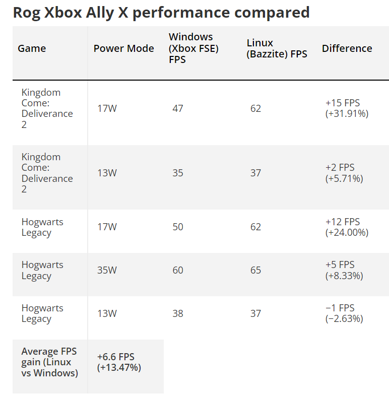 Уже сейчас Linux способен полноценно соперничать с Windows по производительности в играх. Это особенно заметно на портативных геймерских системах, где ресурсы и энергопакет ограничены. Так, на ASUS ROG Xbox Ally, поставляемом с Windows 11, тесты с дистрибутивом Bazzite показали прирост до +32 % FPS и более ровный график кадросекунд в Kingdom Come: Deliverance 2, а также более предсказуемую производительность в ряде других проектов. Помимо FPS, улучшились «побочные» метрики гейминга: стабильность фреймтайма, более быстрое выход из сна и отсутствие характерных Windows-задержек при переключении между задачами. Такие результаты подтверждались в независимых тестах и на других конфигурациях.