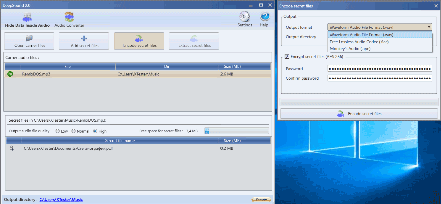 Программа может просто поместить любой файл внутри музыкального, или предварительно зашифровать его по алгоритму AES с длиной ключа 256 бит. Опытным путем было установлено, что предельная длина пароля — всего 32 символа. Мои обычные пароли были длиннее и приводили к ошибке (anunhandled exception).
