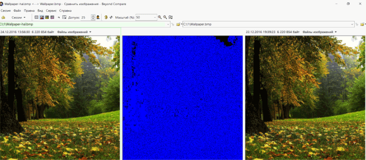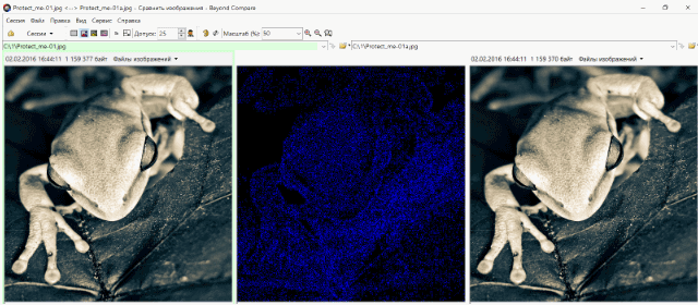 Сравнение утилитой Beyond Compare показывает едва различимые отличия. В первую секунду их не видно вообще. Надо прибавить яркости и присмотреться, чтобы разглядеть на черном фоне равномерно рассеянные темно-синие точки.
