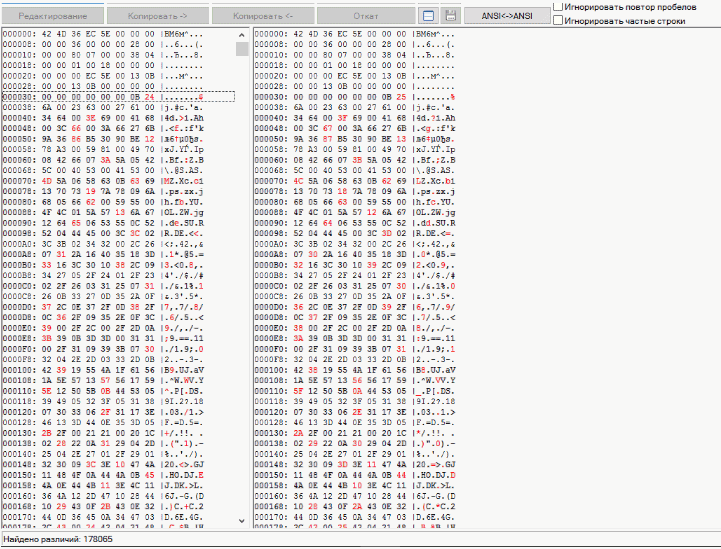 Здесь нас ждет приятный сюрприз: размеры файлов идентичны, а их содержимое различается сразу после заголовка. Байты отличаются почти везде через один, причем на малые значения. Скорее всего, перед нами реализация алгоритма LSB (Least Significant Bit — наименьший значащий бит).