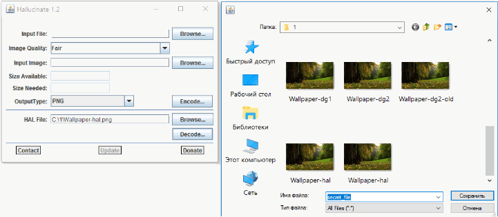 Последняя версия программы Hallucinate(v. 1.2) вышла в ноябре 2015 года. Эта компактная (всего 34 Кбайт) утилита написана на Java и не требует установки. В качестве контейнера она поддерживает форматы BMP и PNG, что делает ее гораздо удобнее Anubis. Картинки PNG используются сегодня куда чаще, чем BMP. Их полно даже во временных каталогах браузера, поэтому лежать одиноким и очень заметным файлом на диске такой контейнер точно не будет.