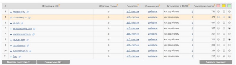 - получаете список площадок, которые система отобрала из ТОП-20 Яндекса и Google, и удаляете те, на которых невозможно размещение ссылок (например, сайты конкурентов);