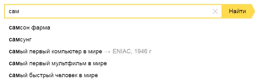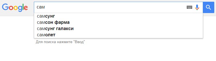 Первым вариантом является продвижение "витальных" запросов. Другими словами брендовых. Например, если мы ввели слово "са..", то Яндекс сразу предложит нам дальше "Самсунг" и официальный сайт.