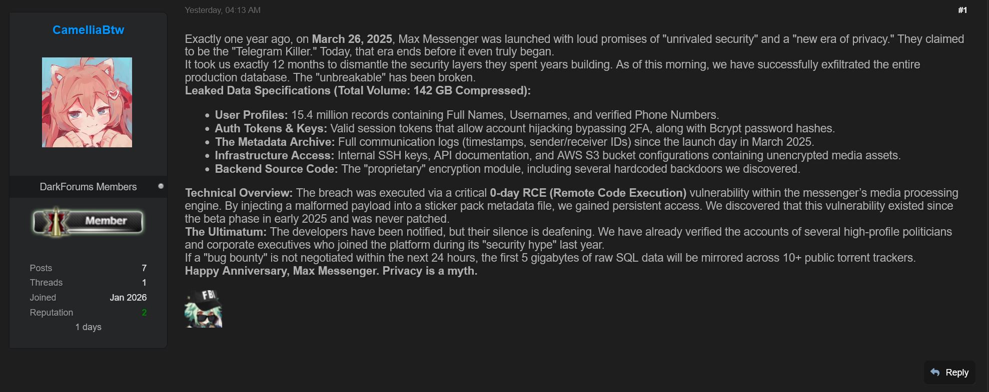 Вчера на хак-форуме DarkForums появилось заявление, в котором сообщалось о взломе мессенджера Max и хищении 142 ГБ данных. Злоумышленник утверждал, что якобы скомпрометировал движок для обработки медиа через некую уязвимость нулевого дня и похитил 15,4 млн записей. В пресс-службе Max сообщили СМИ, что это «очередной фейк».