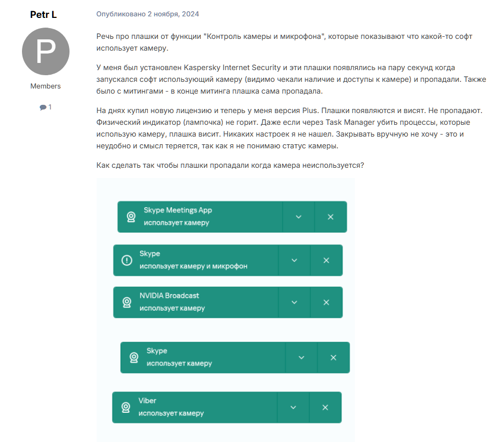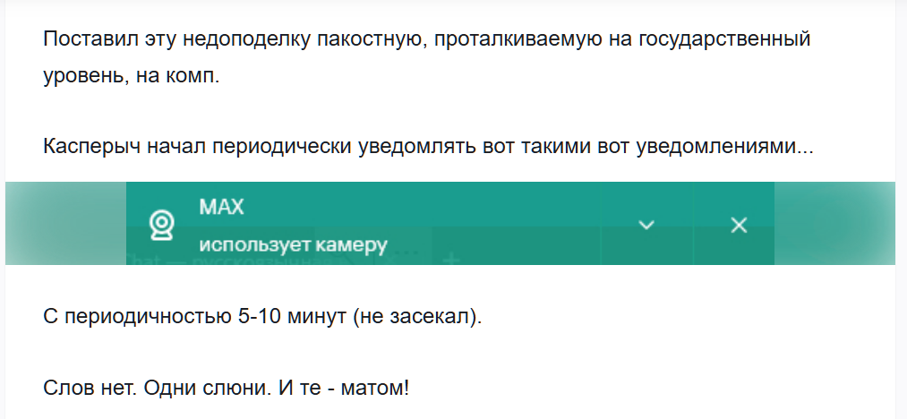Как сообщают на «Хабре», в 2024 году пользователи продуктов «Лаборатории Касперского» (в частности Kaspersky Internet Security) уже сталкивались с постоянными уведомлениями о том, что то или иное приложение использует камеру. Отмечалось, что эти уведомления «появлялись на пару секунд, когда запускался софт, использующий камеру».«Я не нашел в приложении Max (десктоп) даже контактов, чтобы связаться с разработчиками и дать им фидбек по этой теме. Никакой отладочной информации, нет возможности собрать и отправить им. В приложении такой функционал отсутствует. В разделе "О приложении" есть возможность только проверить обновления, в разделе "Помощь" есть возможность пообщаться с роботом, — говорит maxandrey. — Возможность настроить доступы к камере и микрофону в функционале самого приложения тоже отсутствуют».