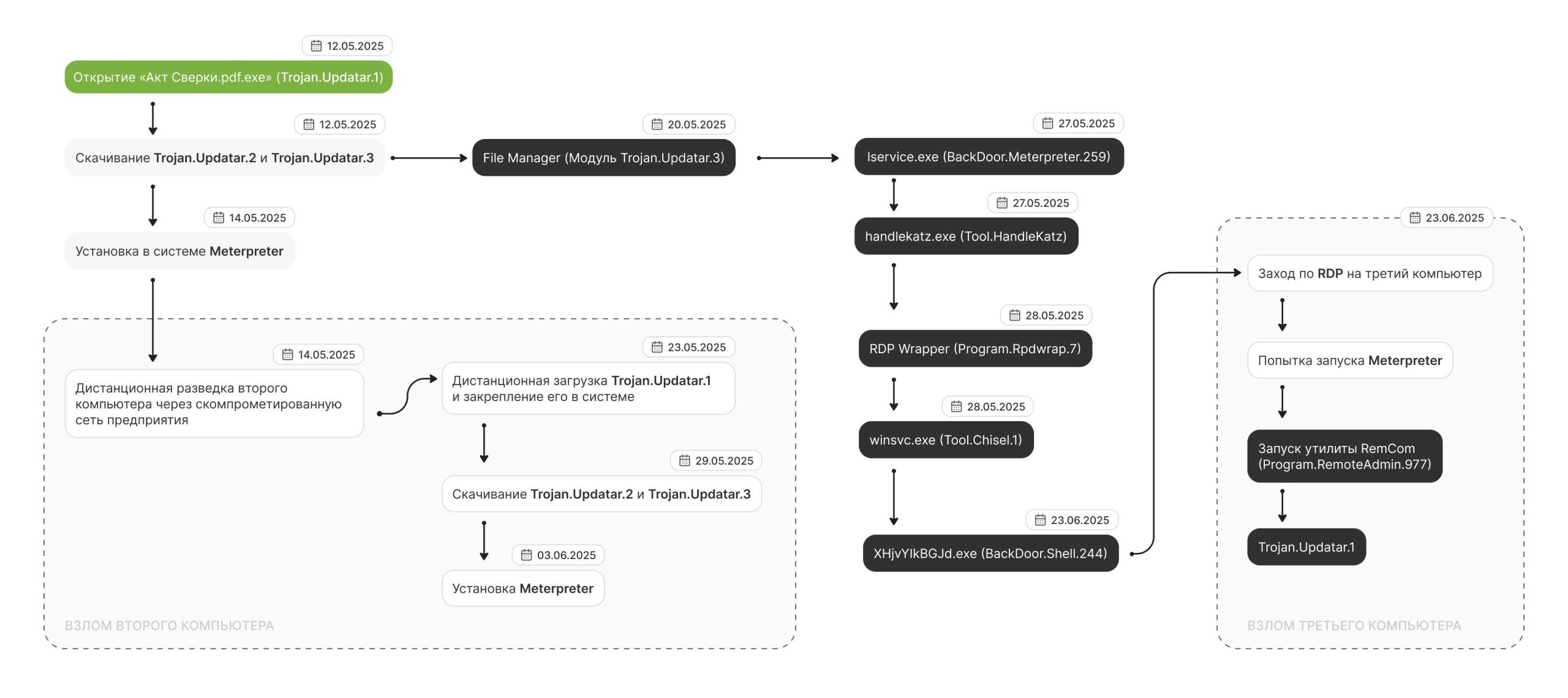 Схема атакиЗаражение первого компьютера предприятия произошло 12 мая 2025 года: троян, пришедший в одном из нежелательных писем, запустился при открытии фальшивого документа. Спустя час после заражения он загрузил и установил в систему другие компоненты бэкдора — Trojan.Updatar.2 и Trojan.Updatar.3.