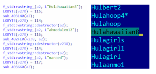 Суть такой обфускации заключается в том, что в теле трояна постоянно инициализируются строчки из словаря RockYou.txt. C ними происходят различные операции, которые никак не влияют на основную функциональность программы. При этом строки, которые непосредственно относятся к работе приложения, закодированы с помощью операции XOR и небольшого смещения. Ключ для смещения и операции XOR является случайным для каждого образца Trojan.Updatar.1.