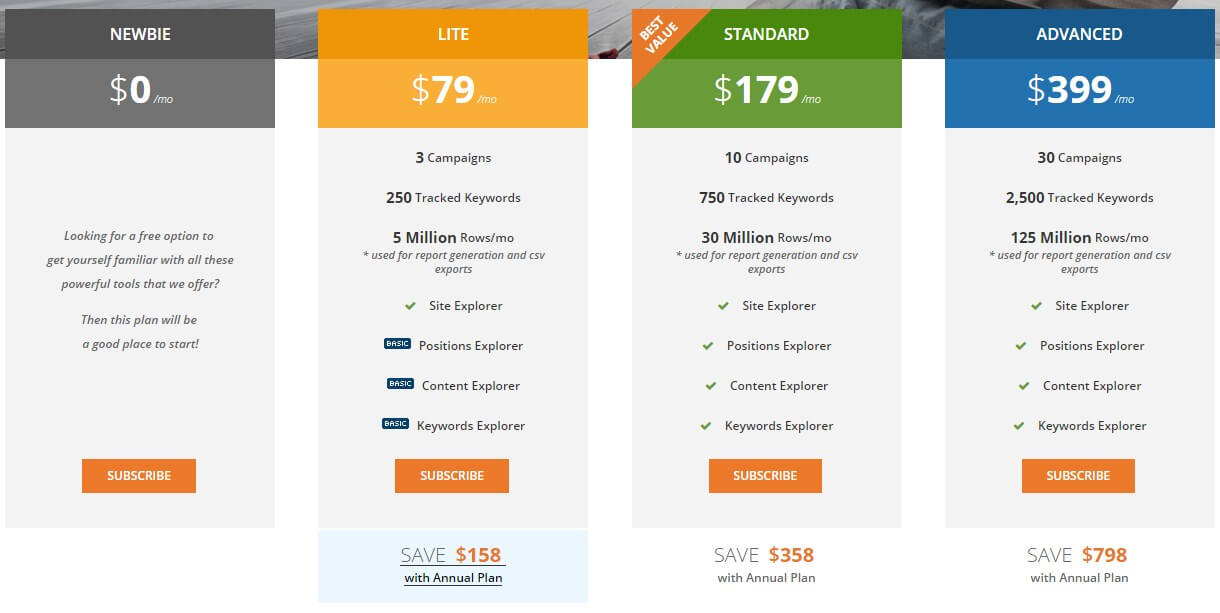 Есть и платная версия, которая предоставляет больше возможностей. Более подробно все возможности и тарифы представлены на странице https://ru.ahrefs.com/pricing-plans:
