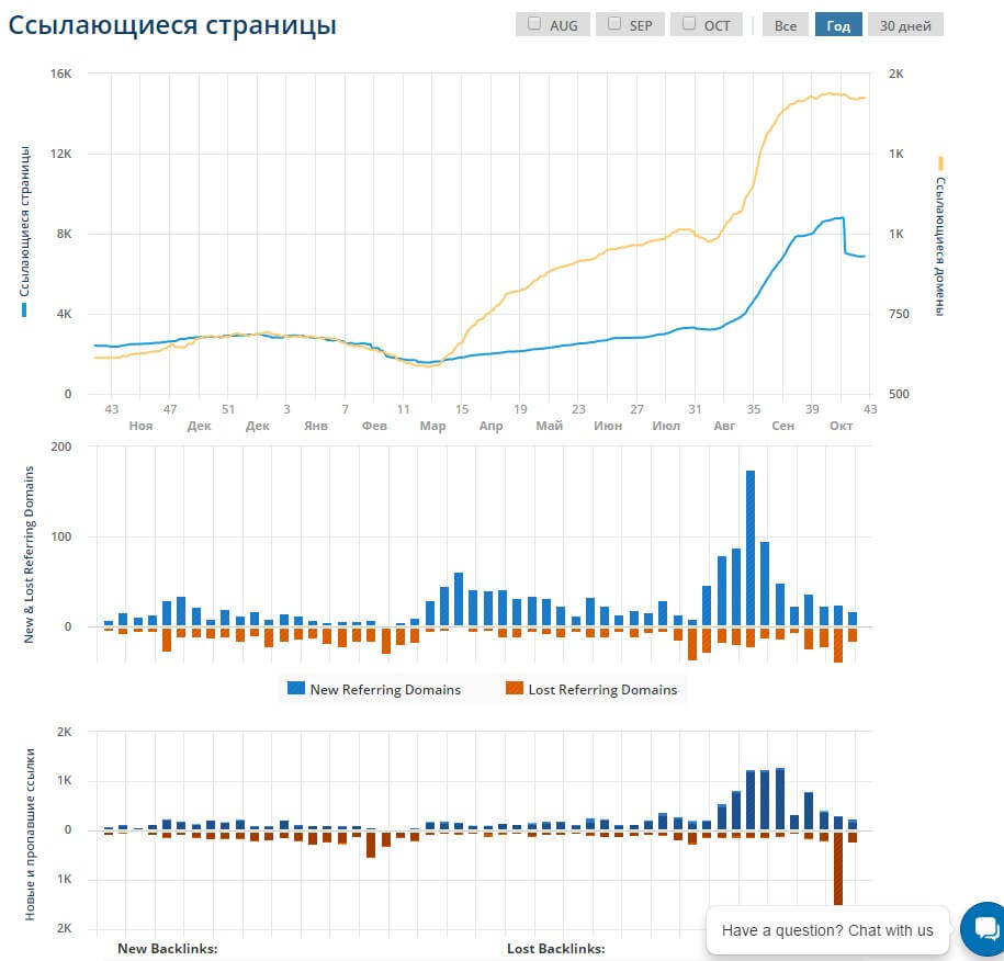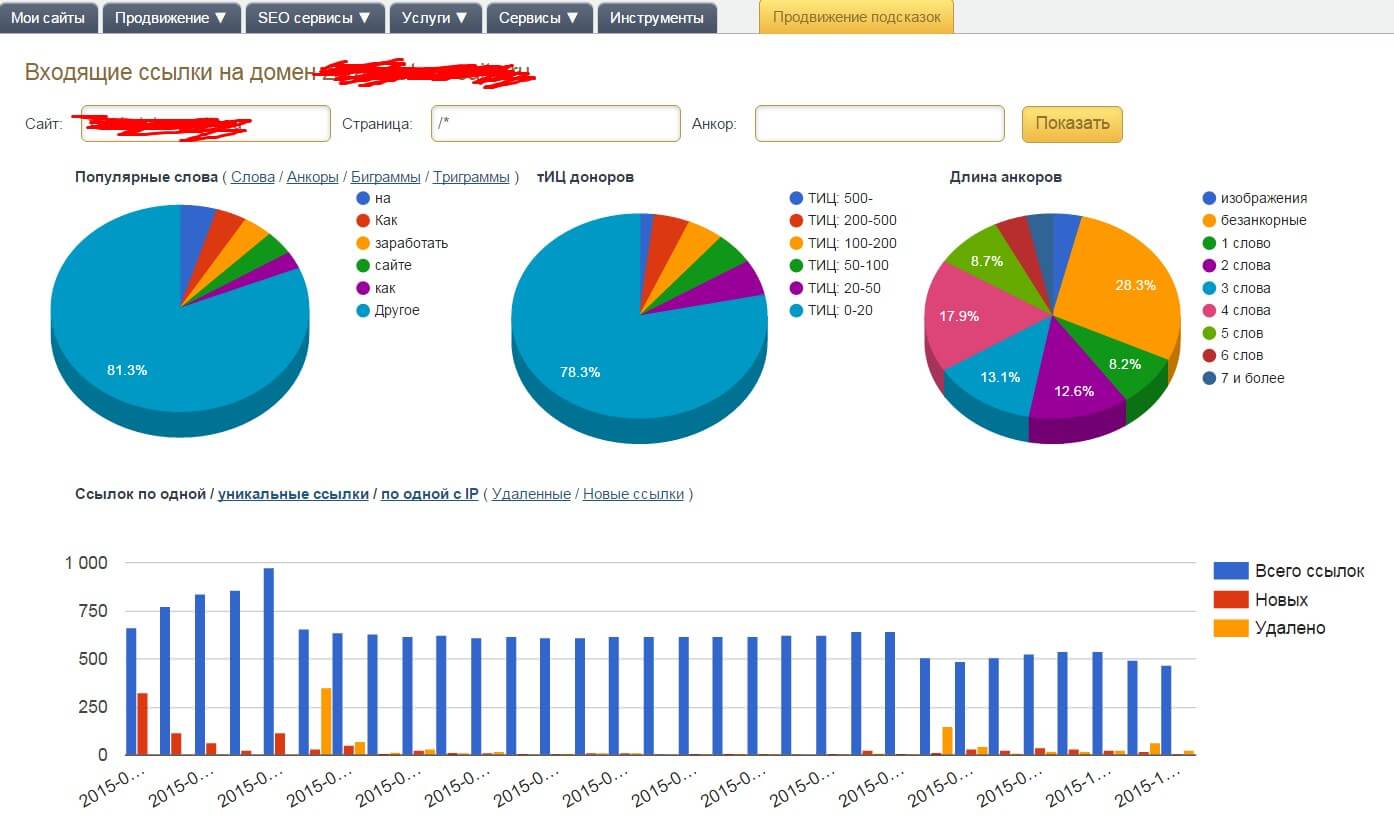 Сервис показывает прирост и потерю ссылочной массы за последние 3 месяца, а также отчет по анкорам.