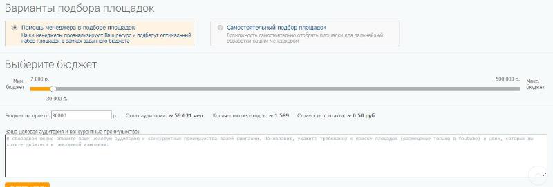 2. Если выбрана помощь менеджера, указываете бюджет, описываете целевую аудиторию, пожелания к контенту, площадкам и запускаете кампанию;
