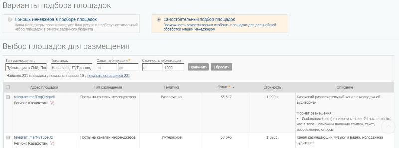 3. Если вы решили самостоятельно вести кампанию, то выбираете площадки из доступных с помощью фильтров и заказываете публикации.