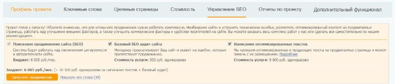 Для эффективного продвижения сайта нужно работать комплексно. Важно найти и устранить технические ошибки, разместить оптимизированные тексты на страницах, улучшать внешние и коммерческие факторы, удобство сайта для посетителей. Весь этот комплекс работ можно заказать в SeoPult (или сделать часть самостоятельно по рекомендациям системы). Так, в модуле SEO доступны опции: «Базовый SEO-аудит сайта» и «Написание оптимизированных текстов».