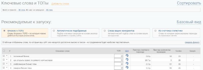 2. Выбираете ключевые слова из списков, предложенных системой, или добавляете свои;