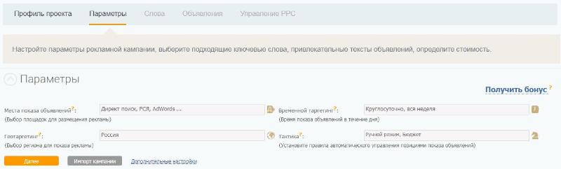 2. Указываете параметры рекламной кампании (места показа объявлений, время и регион показа, тактику и др.);