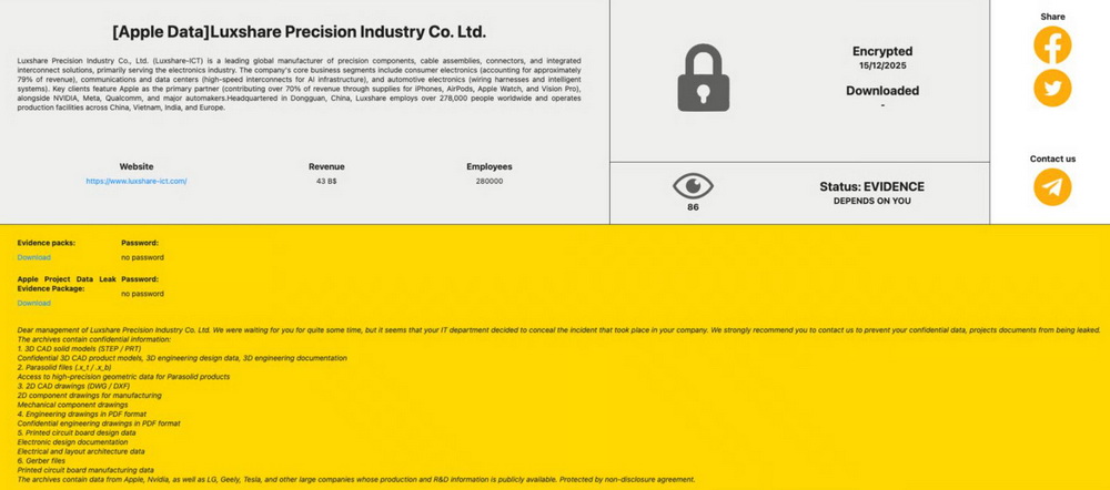 Журналисты проанализировали образцы данных, которые злоумышленники опубликовали в качестве доказательства взлома. Утечка включает детали конфиденциальных проектов по ремонту и логистике устройств между Apple и Luxshare — с таймлайнами, описанием процессов и информацией о других клиентах пострадавшей компании.«Мы довольно долго ждали вашей реакции, но, похоже, ваш ИТ-отдел решил скрыть инцидент. Настоятельно рекомендуем связаться с нами, чтобы предотвратить утечку конфиденциальных данных и проектной документации», — пишут атакующие.