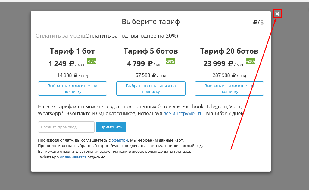 6) У нас появилось окно с выбором тарифа, мы просто закрываем его, нажимаем на крестик.