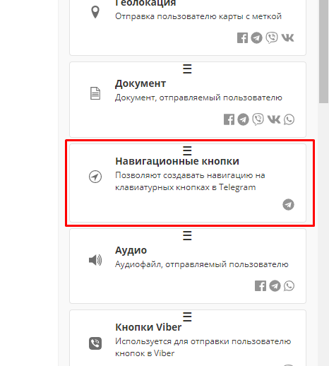 Чтобы добавить функционал нашему боту, мы выбираем в разделе "Палитра" Навигационные кнопки. И просто перетаскиваем в наше "Стартовое окно".