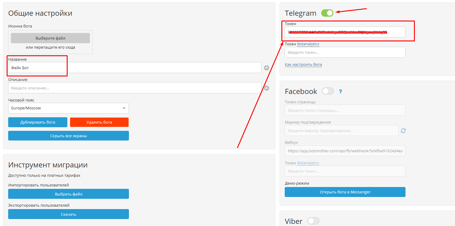8) Придумываем вписываем название бота. Дальше в правой панельке нажимаем кнопку Telegram и вставляем наш токен бота.