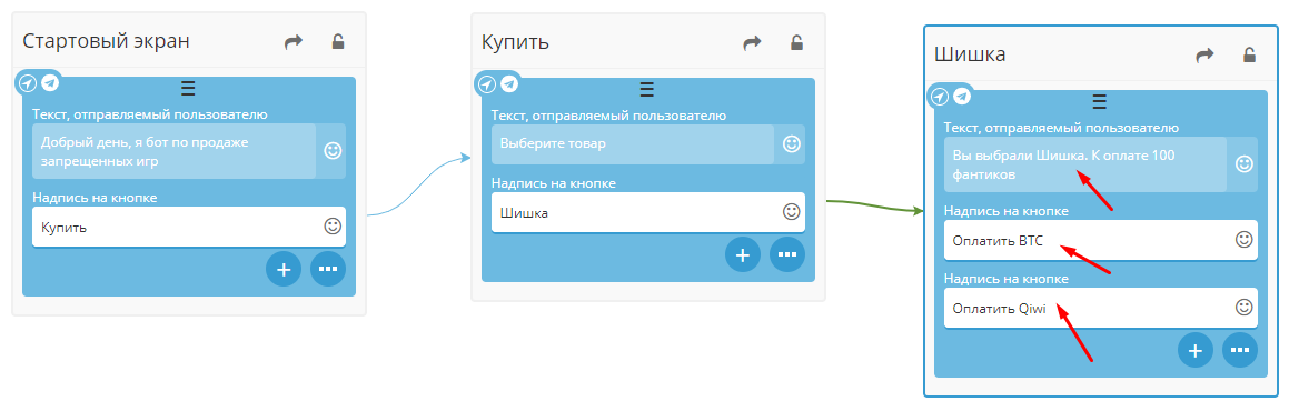 14) Чтобы добавить новое окно или сохранить функционал нашего бота, в правом нижнем углу видим 2 ярлыка (зеленая кнопка - это сохранить), (синяя кнопка - это добавить новое окно).