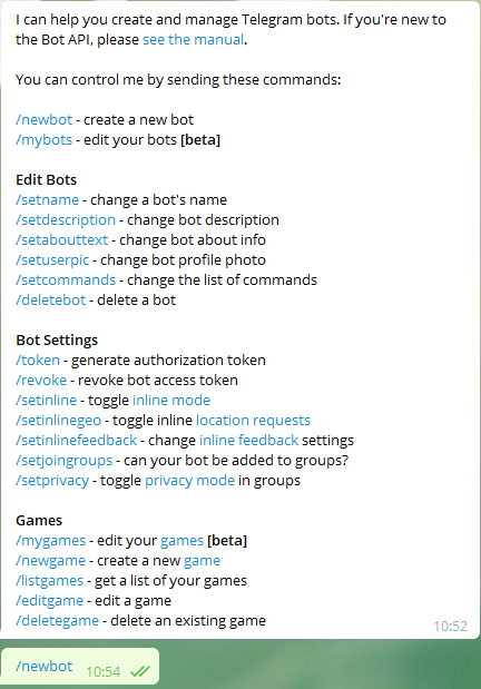 1) Находим в telegramm @BotFather. И пишем /start. Видим, как появилось сообщение от бота с командами.