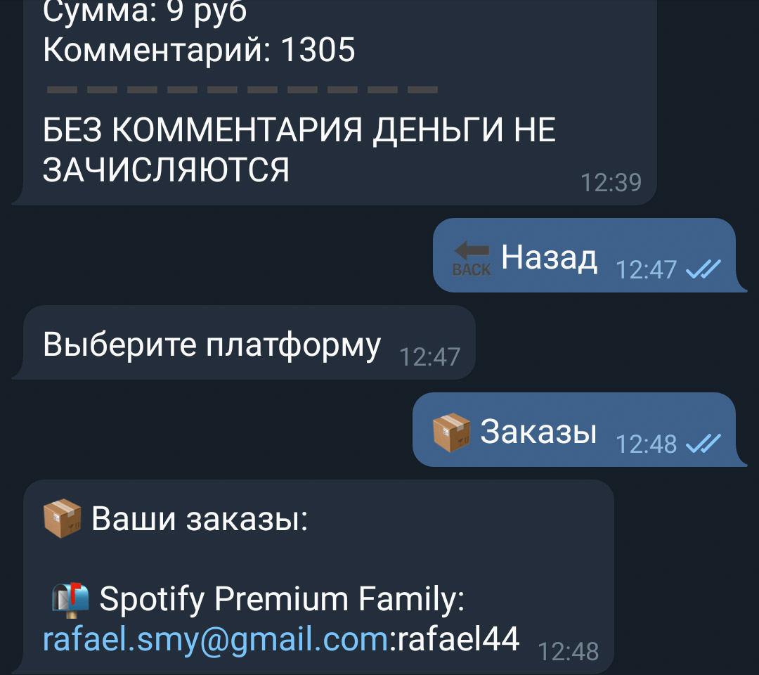 8.Если бот выдаст вам аккаунт но вы это делали клиентом сообщение потеряется но есть такая кнопка мои покупки или заказы.
