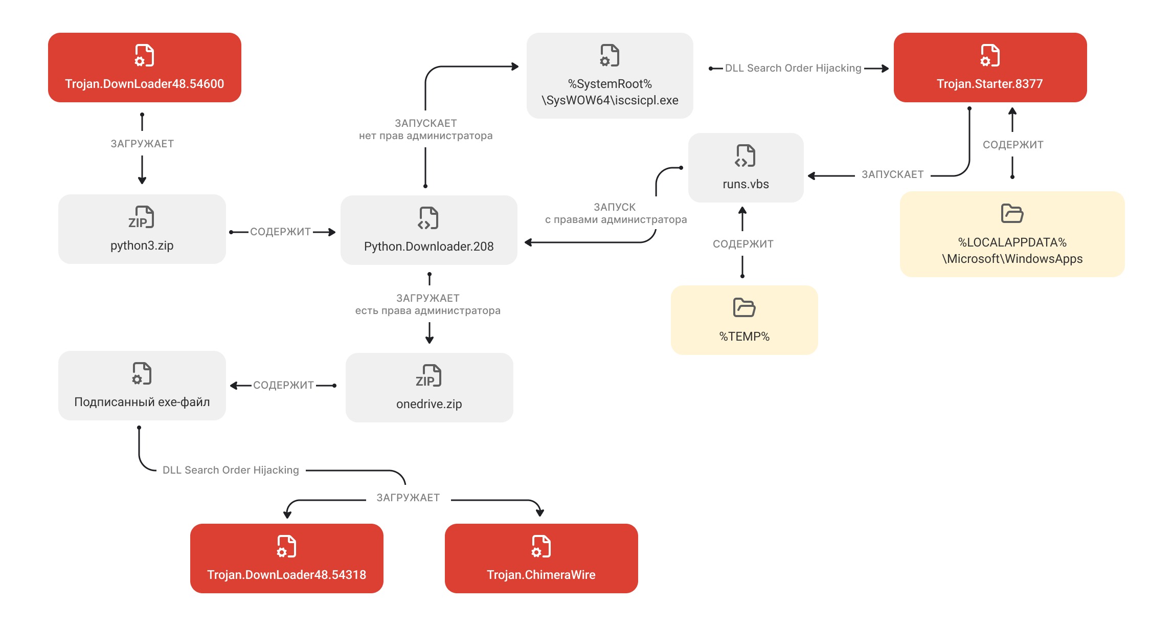 Первая цепочка заражения стартует с трояна Trojan.DownLoader48.54600. Он проверяет, не работает ли на виртуальной машине или отладчике, и если все чисто — загружает с управляющего сервера архив python3.zip. Внутри находятся Python-скрипт (Python.Downloader.208) и вредоносная библиотека ISCSIEXE.dll (Trojan.Starter.8377). Скрипт распаковывается и запускается.