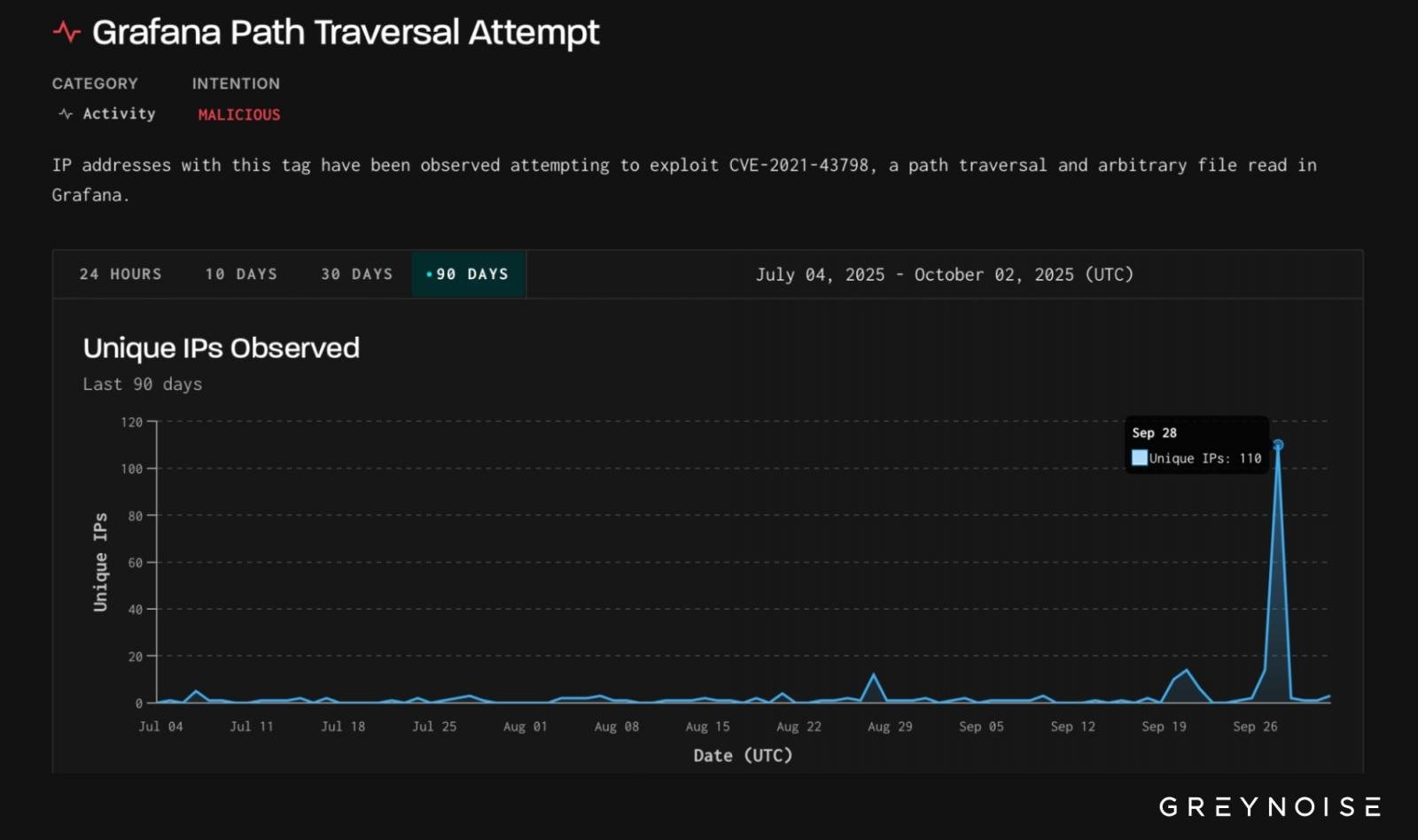 Следует отметить, что еще в прошлом месяце аналитики ИБ-компании GreyNoise предупреждали о необычно высокой активности — сканированиях, нацеленных на выявление старой уязвимости обхода пути в Grafana. Можно предположить, что злоумышленники искали доступные инстансы в преддверии раскрытия новой уязвимости.