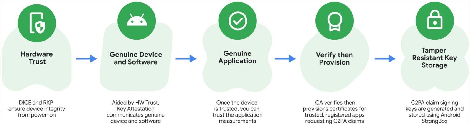- Android Key Attestation, позволяющий удостоверяющим центрам C2PA Google проверять подлинность как аппаратного обеспечения, так и приложения, запрашивающего данные;