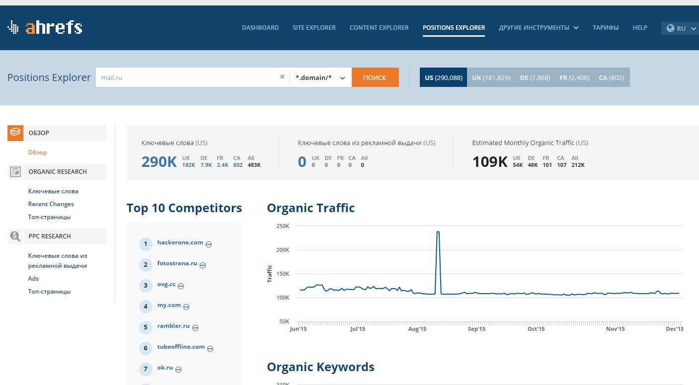 4. В AHREFS главная задача этого сервиса - проверка входящих ссылок на сайт, но помимо этого здесь можно и проверить позиции.