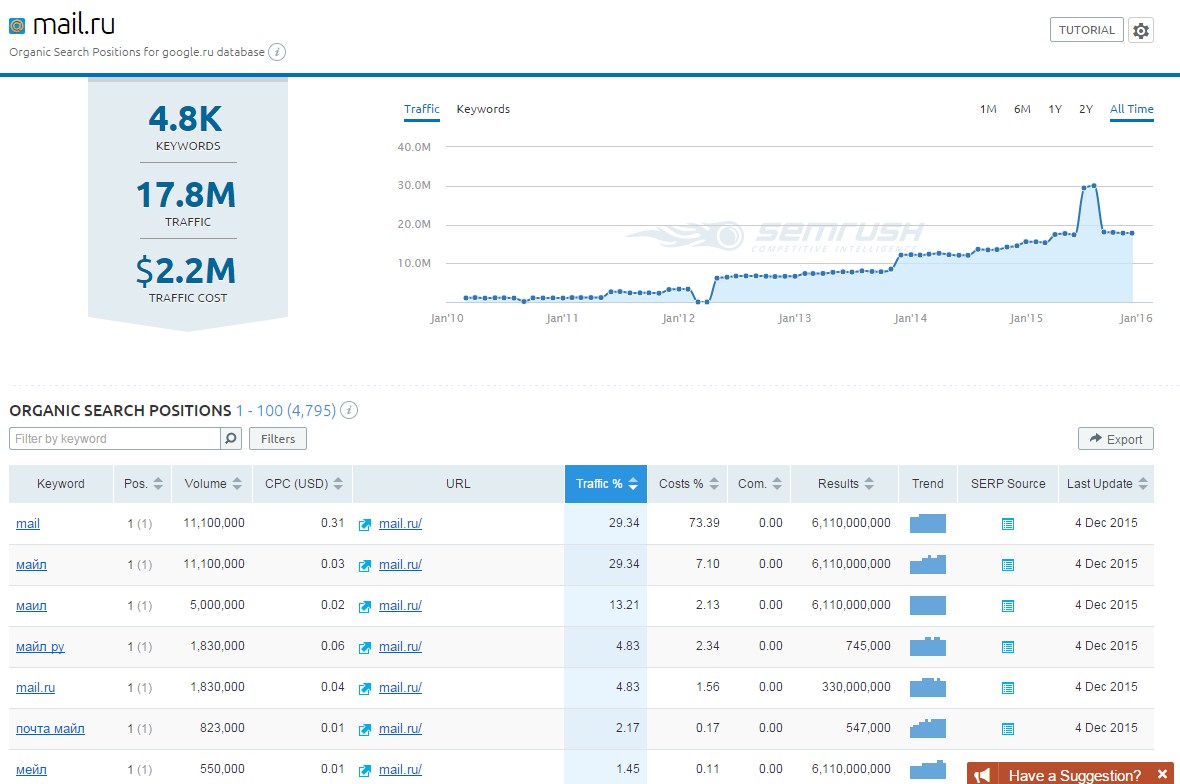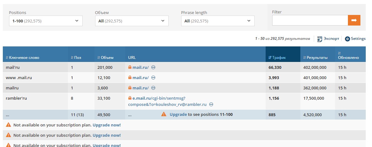 После чего система выдаст каталог всех поисковых запросов, которые система нашла на высоких позициях: