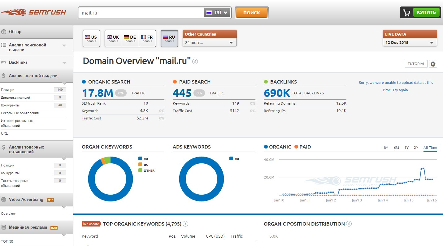 3. В SEMRUSH есть также множество вариантов для анализа сайтов. В частности здесь можно изучить семантическое ядро любого сайта. Единственным минусом - есть ограничения на бесплатные возможности.