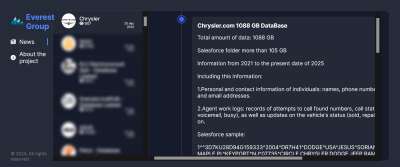 Хакерская группировка Everest опубликовала на своем сайте в даркнете заявление о взломе систем американского автопроизводителя Chrysler. Согласно заявлению злоумышленников, они украли у компании 1088 ГБ данных — всю базу, связанную с операциями Chrysler.