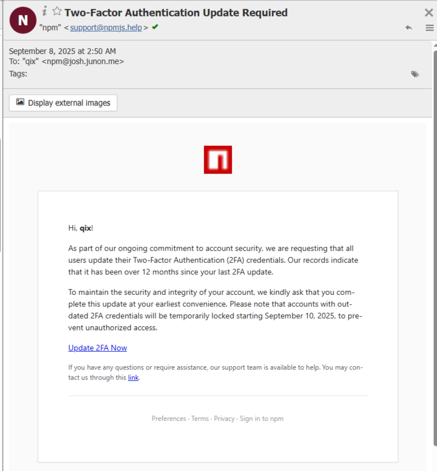 Он рассказал, что получил фишинговое письмо с адреса support@npmjs[.]help — домена, зарегистрированного 5 сентября 2025 года. Размещенный по этому адресу сайт маскировался под легитимный домен npmjs.com.