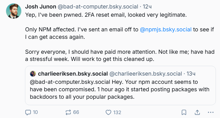 Вечером 8 сентября 2025 года мейнтейнер Джош Джунон (Josh Junon), также известный под ником Qix, сообщил, что его аккаунты были захвачены в ходе атаки и ему известно о компрометации.